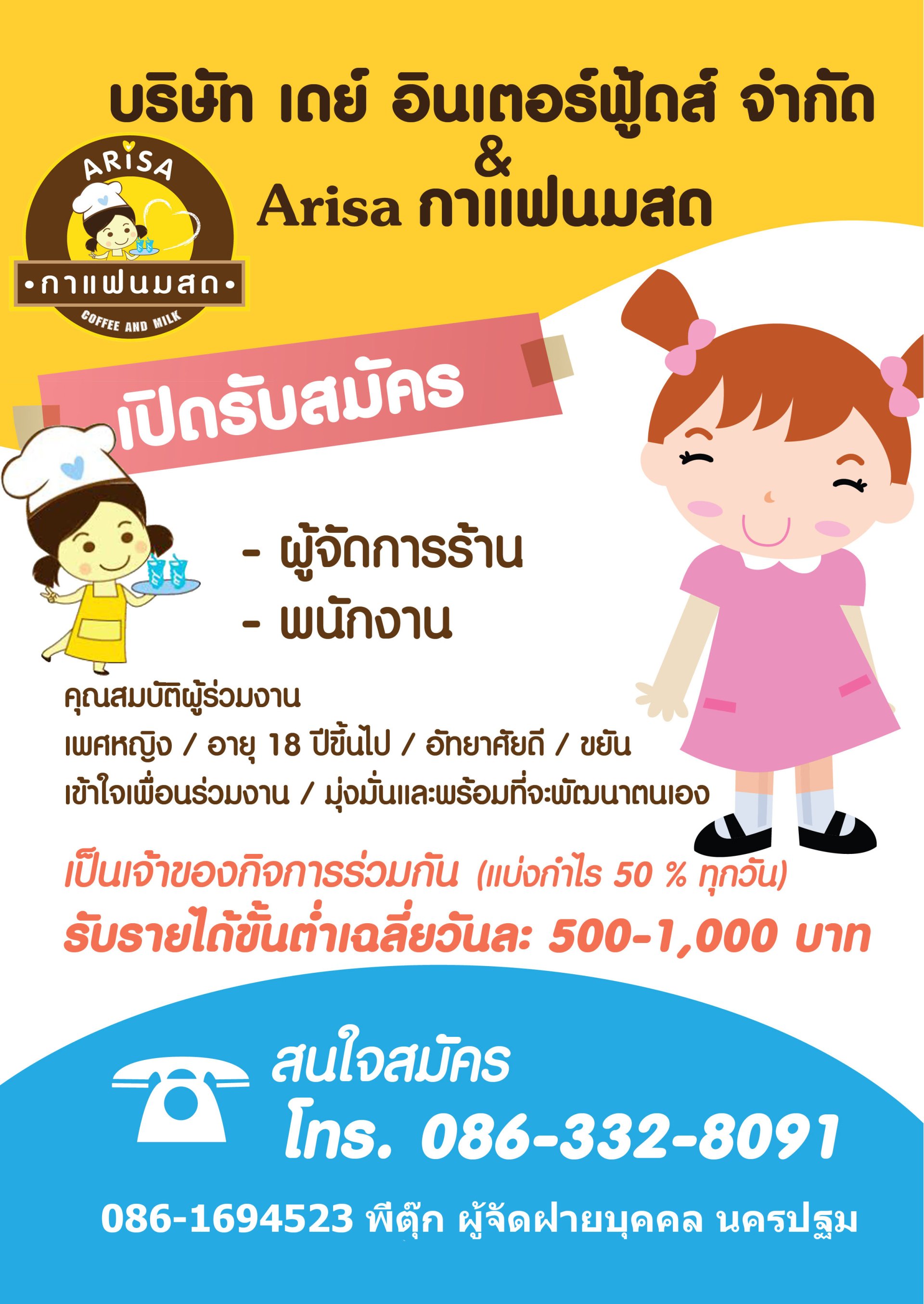 ซึ่งคุณสามารถเลือกกำหนดวันหยุด สถานที่ เมนู ราคา และเวลาขายได้เอง ง่ายๆ สบายๆ โดยเป็นกิจการของคุณเอง 100 % เต็ม ไม่มีรายปี รายเดือน หรือ ข้อบังคับ ให้ซื้อสินค้าขั้นต่ำ อะไรต่ออะไร มากดดันคุณให้วุ่นวาย ฯลฯ ซึ่งตรงนี้คุณจะได้รับการช่วยเหลือ จากบริษัทอย่างเต็มที่ เช่น การลงโฆษณาประชาสัมพันธ์ให้คุณฟรีทางเฟสบุ๊ค เพื่อสร้างฐานลูกค้าเพิ่มให้แก่คุณ